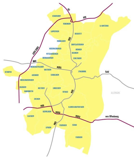 Lavemissionszonen i Strasbourg omfatter alle 33 kommuner i regionen. Restriktionerne påvirker ikke hovedvejene A4, A35, N83, N353 og D1083.
